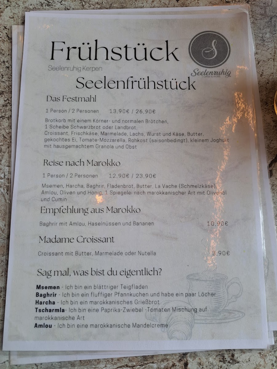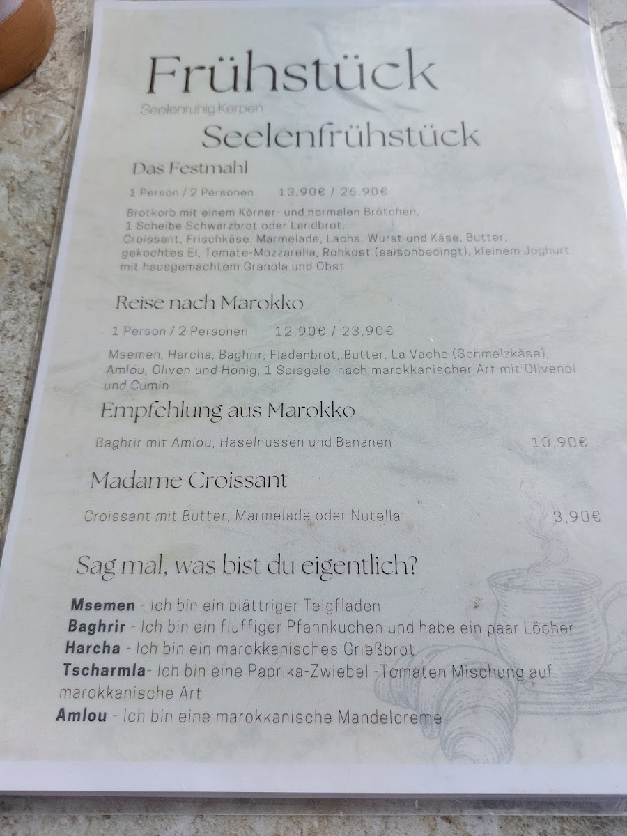 The menu offers a range of items suitable for breakfast, coffee breaks, and light meals throughout the day. Visitors can find a selection of coffee drinks including cappuccino and matcha latte, alongside traditional Moroccan beverages such as mint tea. Food options focus on light dishes and small plates, with breakfast items featuring eggs prepared in different styles.